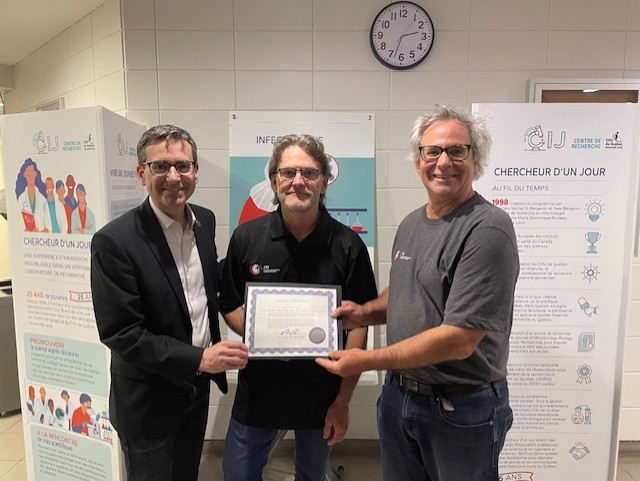 « Un grand merci pour votre implication sans failles à notre journée « Portes Ouvertes » dans le cadre du 50e du Centre de Recherche en Infectiologie (CRI). Ce fut un succès sur toute la ligne avec une participation citoyenne au-delà de mes espérances. J’ai constaté avec plaisir la passion qui vous animait lorsque vous présentiez vos recherches. J’ai reçu des tonnes de commentaires élogieux de la part du public participant à cette journée. Vous avez fait honneur au CRI, au Centre de Recherche du CHU de Québec, et à l’Université Laval. Milles Bravos! »